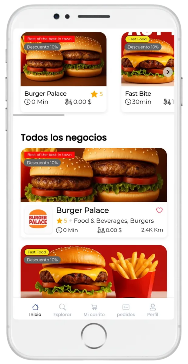 Los clientes navegan por restaurantes, seleccionan productos, pagan y siguen la entrega en tiempo real desde la app.
